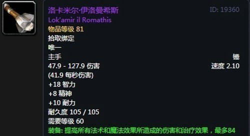 洛卡米尔伊洛曼希斯,单手权杖,出自黑翼之巢副本奈法利安掉落,推荐附魔治疗能量。