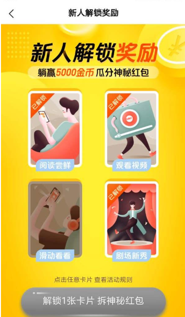 1、新人奖励板块。刚加入的新手朋友输入邀请码可以获得1元奖励,此外会有一次解锁四个卡片获取金币的奖励,每解锁一张图片是可以获取666个金币奖励,而四张图片全部解锁,一共可以获得2664个金币的奖励,额外还送1666金币的奖励,总共算下来就是4330个金币的奖励。