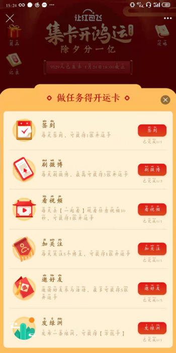 任务1:来活动页面签到,可随机获得1张开运卡;
