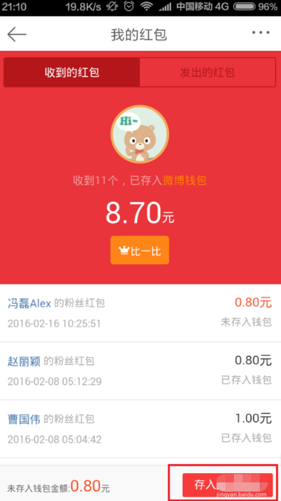 4、然后将获得的红包金额存入我们的钱包。