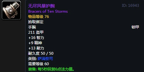 属性:211护甲,+16智力,+9精神,+13耐力,装备效果每5秒回复6点法力值。