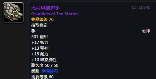 属性:301护甲,+17智力,+13精神,+15耐力,+10暗影抗性,装备效果每5秒回复6点法力值,提高所有法术和魔法效果所造成的伤害和治疗效果,最多8点,提高法术所造成的治疗效果,最多15点。