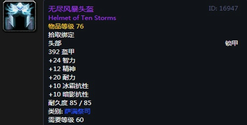 属性:392护甲,+24智力,+12精神,+20耐力,+10冰霜抗性,+10暗影抗性,装备效果使你的法术造成致命一击的几率提高1%,提高所有法术和魔法效果所造成的伤害和治疗效果,最多9点,提高法术所造成的治疗效果,最多18点。