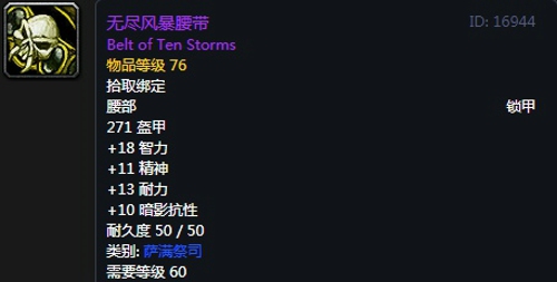 属性:271护甲,+18智力,+11精神,+13耐力,+10暗影抗性,装备效果使你的法术造成致命一击的几率提高1%,提高法术所造成的治疗效果,最多26点。