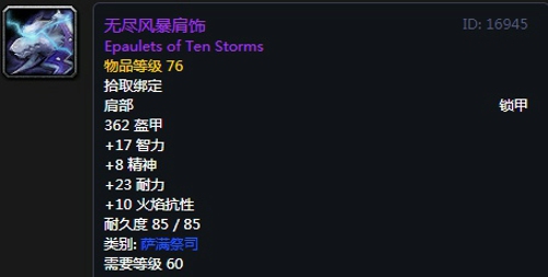 属性:422护甲,18智力,+20精神,+16耐力,+10火焰抗性,+10奥术抗性,装备效果使你的法术造成致命一击的几率提高1%,提高所有法术和魔法效果所造成的伤害和治疗效果,最多29点。