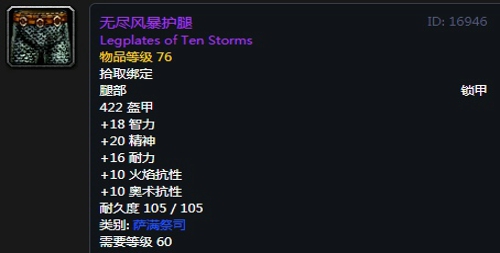 8、无尽风暴护腿:紫色品质锁甲腿部,出自熔火之心副本拉格纳罗斯掉落。