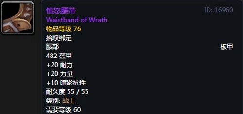 8、愤怒腰带:紫色品质板甲腰带,出自黑翼之巢副本堕落的瓦拉斯塔兹掉落。