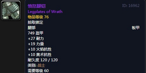 5、愤怒腿铠:紫色品质板甲腿部,出自熔火之心副本拉格纳罗斯掉落。