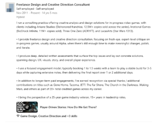 “我经营一家为电子游戏开发提供创意分析与设计解决方案的咨询公司。客户包括Arkane Studios(《耻辱》系列,全系列销量超过1250万份)、Irrational Games(《生化奇兵:无限》,销量超过1100万份)、Three One Zero(《ADR1FT》)以及LucasArts(《星球大战1313》)。”