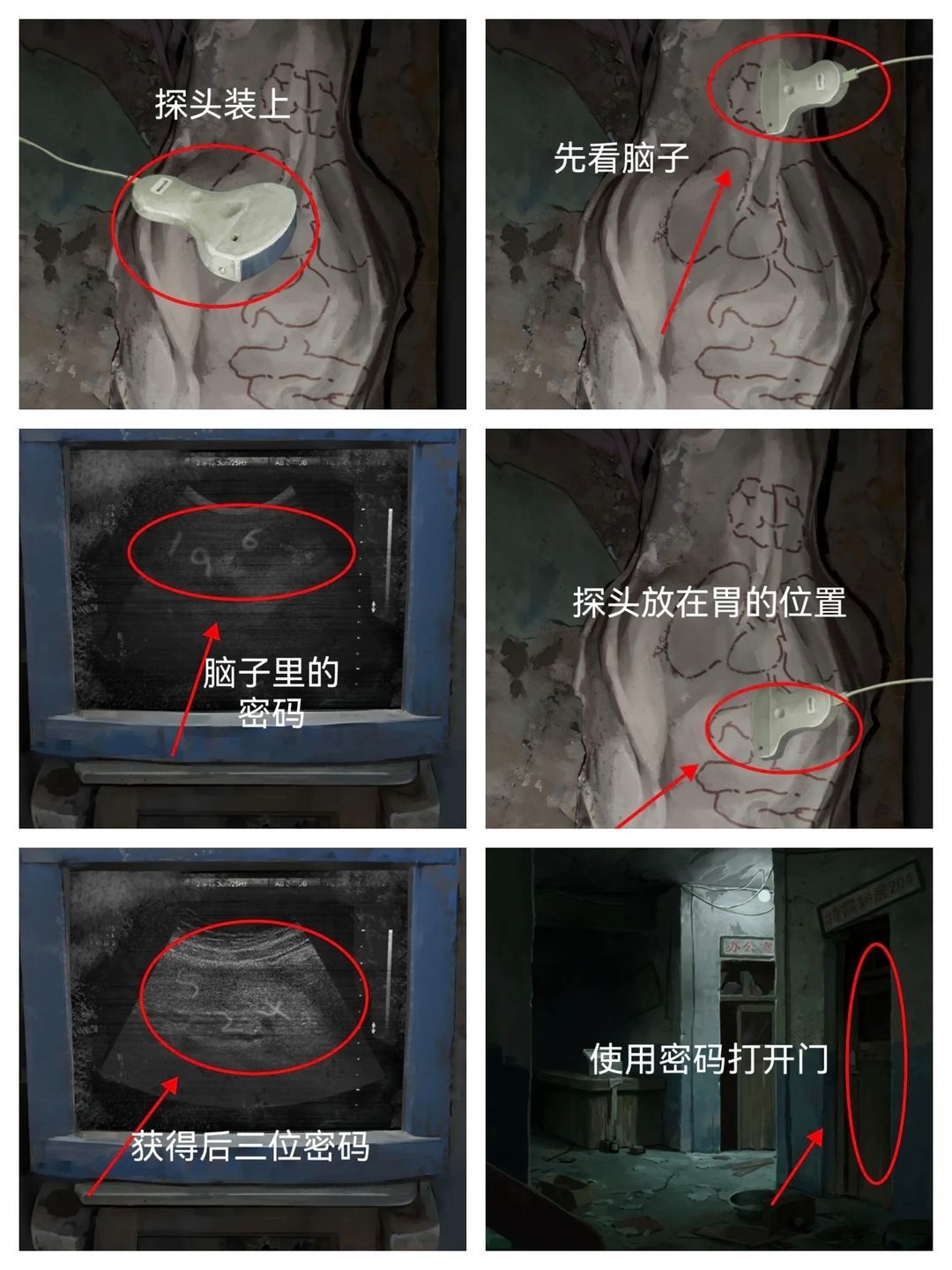 7、二楼解谜:将小人偶放在左边柜子的抽屉位置,获得【探头】。查看二楼门的密码提示,输入密码【196524】打开门