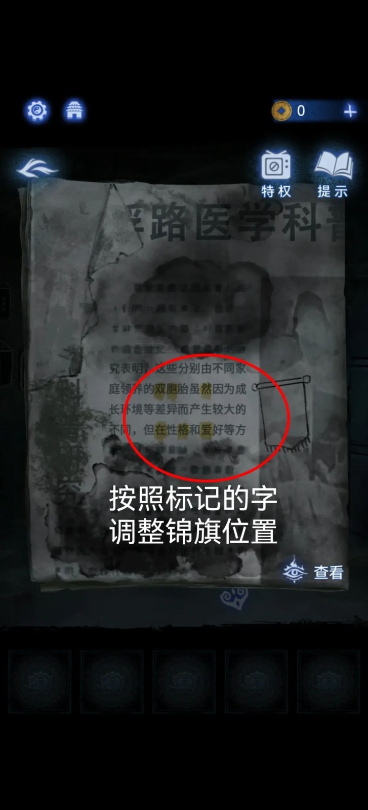 5、办公室解谜:使用手术钳打开办公室的门,查看墙上的锦旗,根据报纸上的提示调整锦旗的位置,获得【三炷香】。