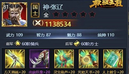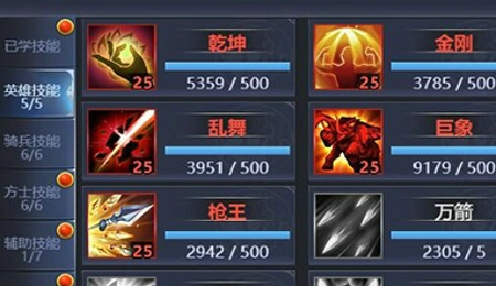 思路分析:张辽作为全才,没有自带的技能使得张辽的英雄技能更为自由,由于张辽的天赋均为兵种加成,那么乱舞与金刚是最佳的组合;张辽的武力与统帅为张辽的优势属性,建议学习巨象与枪王。