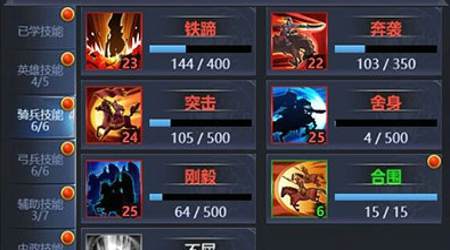 骑兵技能推荐:铁蹄、奔袭、突击、舍身、刚毅。