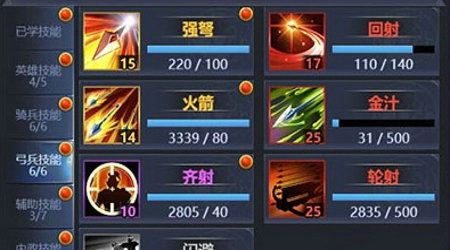 弓兵学习技能推荐:火箭、金汁、强弩、回射、齐射。