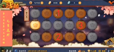 点击图中的花灯1即可,前面的关基本都是送的,这关直接点击1的位置触发十字就可以了.