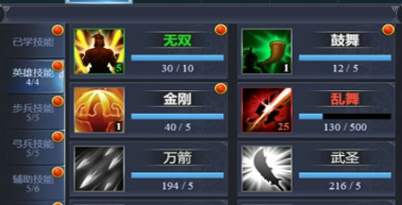 思路分析:赵云由于自身每回合增加攻防的天赋,自带的无双可在近战回合打出高额的伤害,同时推荐学习金刚与鼓舞来增加在远战过程中的防御,拖延到近战回合;最后一个技能推荐学习武圣,赵云的武力与魅力都不算低,可以打出完美的武圣伤害。(下图仅技能列表参考)