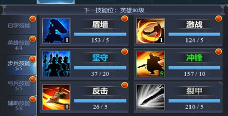 步兵技能推荐:盾墙、激战、坚守、冲锋、反击。