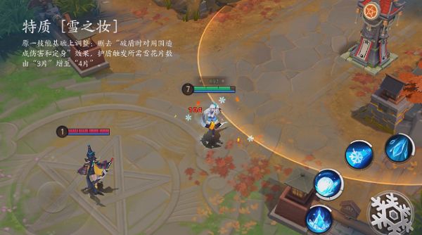 雪女每次使用技能都会获得1片雪花,累计4片雪花时会获得一个可以抵御伤害的[雪之盾]。若雪女8秒内未收到伤害,则会刷新[雪之盾]