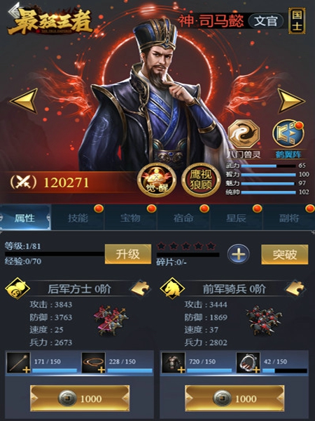 肃清万里,总齐八荒,在《最强王者》这广袤无主之地,万千策略热爱者开启了一场惊世权谋博弈之争。各种经典战法战役涌现,惊心动魄的国战交锋。《最强王者》魏蜀吴三方势力近百名国士、名将,为其增添了层出不穷的战略乐趣。而今,《最强王者》当世权臣司马懿登场,又将为天下局势带来如何变化?无论是从天赋还是四维属性,司马懿都堪称妖孽,君且看。