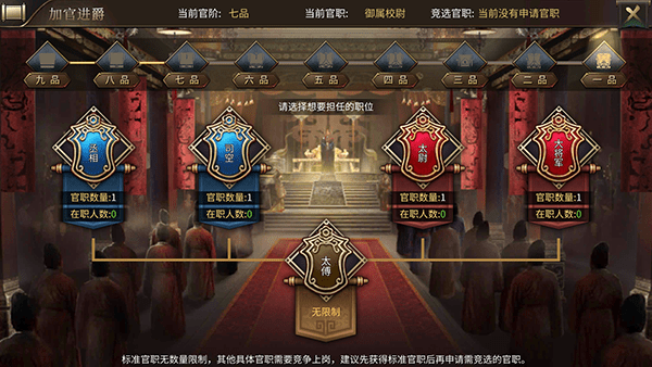 除了在封地中默默发展壮大自己实力外。在所属势力中,通过领取完成国家任务获得国家贡献。当国家贡献累计到一定的标准时可以进行官职升品。官职又分为文职和武职,官职越高,每日俸禄中的游戏道具奖励越为丰厚。