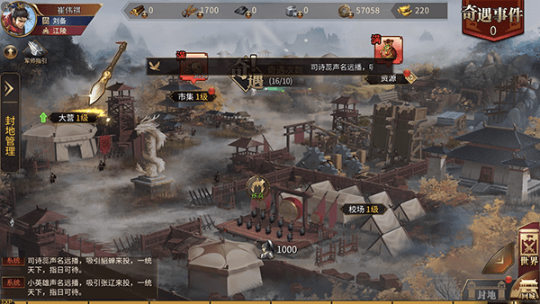 选择一方势力后,便可获得朝廷认可,获得专属于自己的封地。在封地里,可以开拓良田、采石伐木以积储必备的基础战略资源。还可进一步市集赋税、校场练兵来不断壮大自己实力。同时封地内还有不时的如百姓请愿、山贼劫掠等各类奇遇事件,为日常的游戏过程平添一份趣味。完成奇遇事件后,还可获得额外奖励。