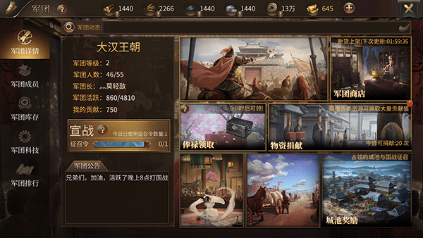 积储资源,校场练兵,结天下名将。如此一番韬光养晦,壮大自身实力后,想要割据一方,自然少不了其他玩家的结盟相助。玩家可自己成立军团或者加入其他玩家的军团,军团之中可以领取军团俸禄,在军团商城兑换超值道具以及通过发展军团科技提升个人战力。
