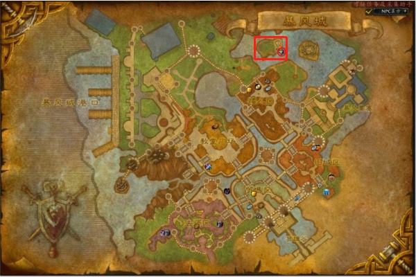 联盟的玩家可以先回到暴风城,然后再来到上图之中红色框之中的地点找到传送到潘达利亚大陆的传送门,然后再跑到锦绣谷即可。
