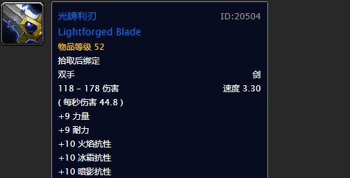 1、光铸利刃:蓝色双手剑,118-178伤害,攻速3.30,+9力量,+9耐力,+10火焰抗性,+10冰霜抗性,+10暗影抗性,装备效果提高神圣法术和效果所造成的伤害,最多16点。