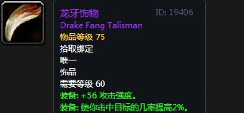 龙牙饰物:饰品2,出自黑翼之巢副本埃博诺克掉落,无法附魔。