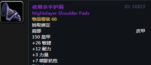 基础属性:126护甲,+13力量,+20敏捷,+15耐力,+10暗影抗性,装备效果使你造成暴击的几率提高1%。