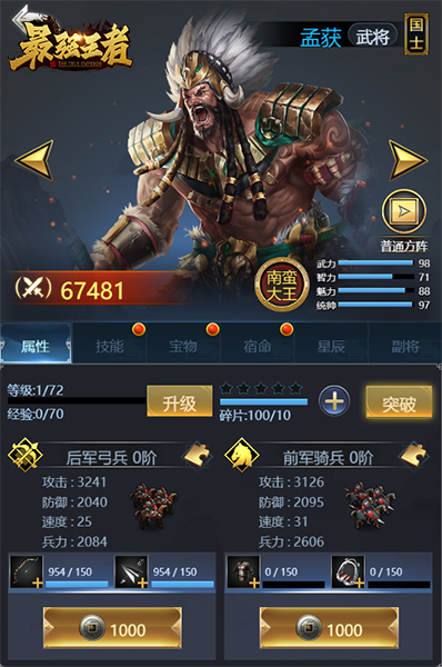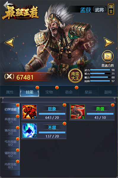 思路分析:孟获有着独有技能巨象并且有着高额的武力与统帅巨象基本不会损失自己的兵力是孟获的必修技能;高额的武力推荐学习无双与乱舞打出高额的爆发伤害,天赋中巨象与增员还可增加兵种的属性,推荐再学习鼓舞使得孟获的兵种属性锦上添花。