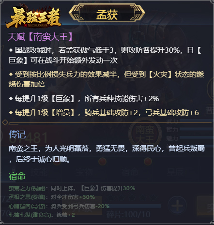 效果1:国战攻城中,若孟获无傲气,则攻防各升级40%,且【巨象】可在战斗开始额外发动一次。