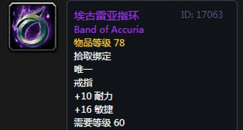 16、埃古雷亚指环:戒指1,出自熔火之心拉格纳罗斯掉落,无法附魔。