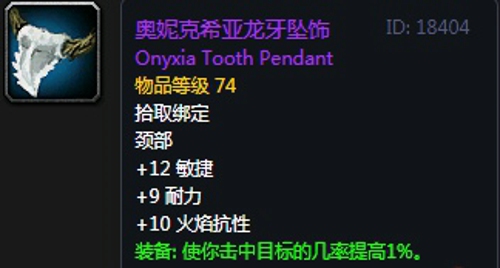 18、奥妮克希亚龙血护符,饰品2,奥妮克希亚龙头任务奖励装备,无法附魔。