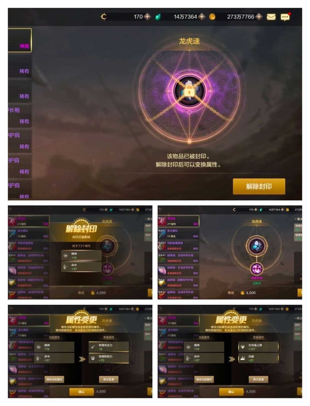 这里大家要注意:“稀有、神器、史诗”级别的装备也就是3级以上的装备才具有魔法封印属性,而且接触装备属性是需要材料的,接触装备封印需要的材料也就越高级。