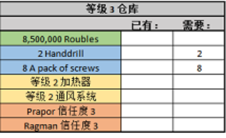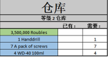逃离塔科夫仓库怎么升级?这个不是一两句话就可以说清楚的,仓库升级所需要的材料比较的多,材料的价格也会随着跳蚤市场的价格波动,下面就来看看图吧。