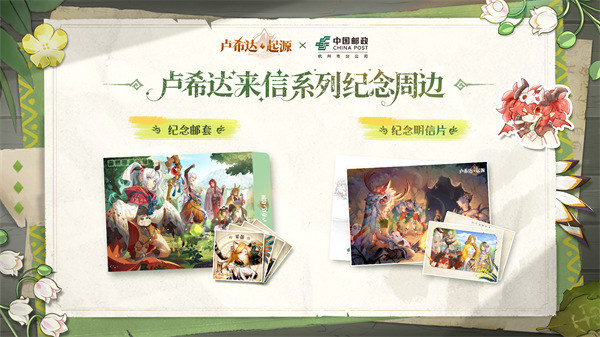 限定联名邮品:中国邮政限量发行《2025纪念限定邮折——卢希达来信》。内含莱蕾、薇拉、黎九、曼奇四位人气角色的专属纪念邮票(共4枚)。参与线上H5网页“一封来自卢希达大陆的信”联动活动,即有机会免费获得纪念邮折!此外,活动中还有定制纪念明信片及丰厚游戏资源相送,数量有限,先到先得。