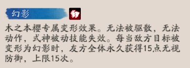 木之本樱专属变形效果。无法被驱散,无法动作,式神被动技能失效。每当敌方目标被变形为幻影时,友方全体永久获得15点无视防御,上限15次。