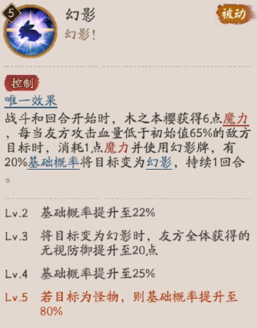 战斗和回合开始时,木之本樱获得6点魔力,每当友方攻击血量低于初始值65%的敌方目标时,消耗1点魔力并使用幻影牌,有20%基础概率将目标变为幻影,持续1回合