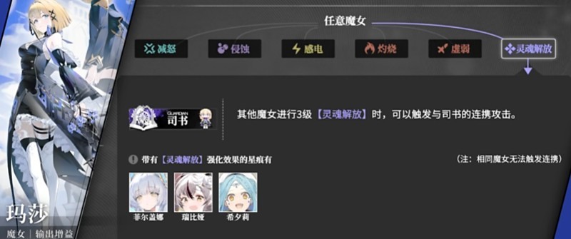 玛莎的基础普攻每次攻击都能对敌方单体造成攻击力伤害,并有50%的概率降低目标15%的异常状态抗性,持续1回合。这一特性为后续技能的异常状态触发提供了良好的铺垫,使得她在队伍中能够有效提升整体输出效率。当玛莎达到13级时,连携技正式解锁,可以在其他魔女施展3级灵魂解放时触发,形成强力的连携攻击,进一步增强队伍的爆发能力。