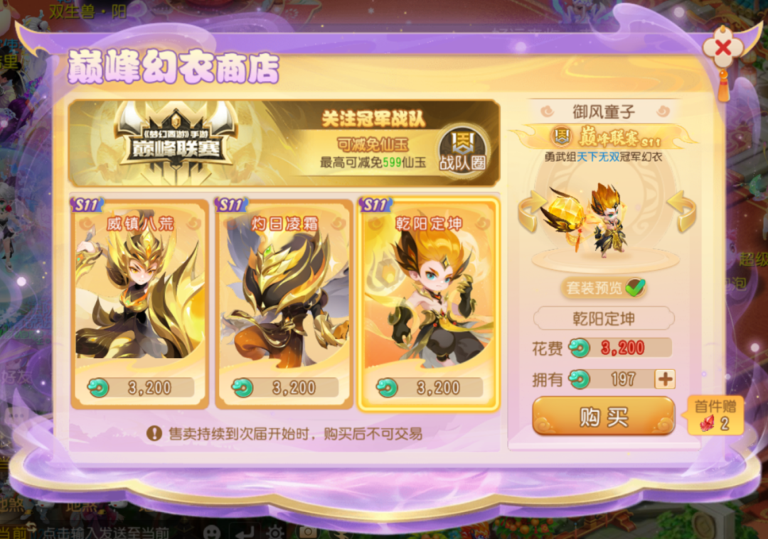 御风童子·乾阳定坤,以鎏金黄与玄墨黑为主色调,宛若晴空与夜幕的交织。这一设计既彰显了御风童子操控风元素的灵动特质,又蕴含着天下无双战队沉稳大气的冠军底蕴。幻衣承载着战队在赛场上运筹帷幄、掌控全局的“乾阳定坤”之志,令穿戴者行走三界时,从容展现“天下无双”的巅峰气场。