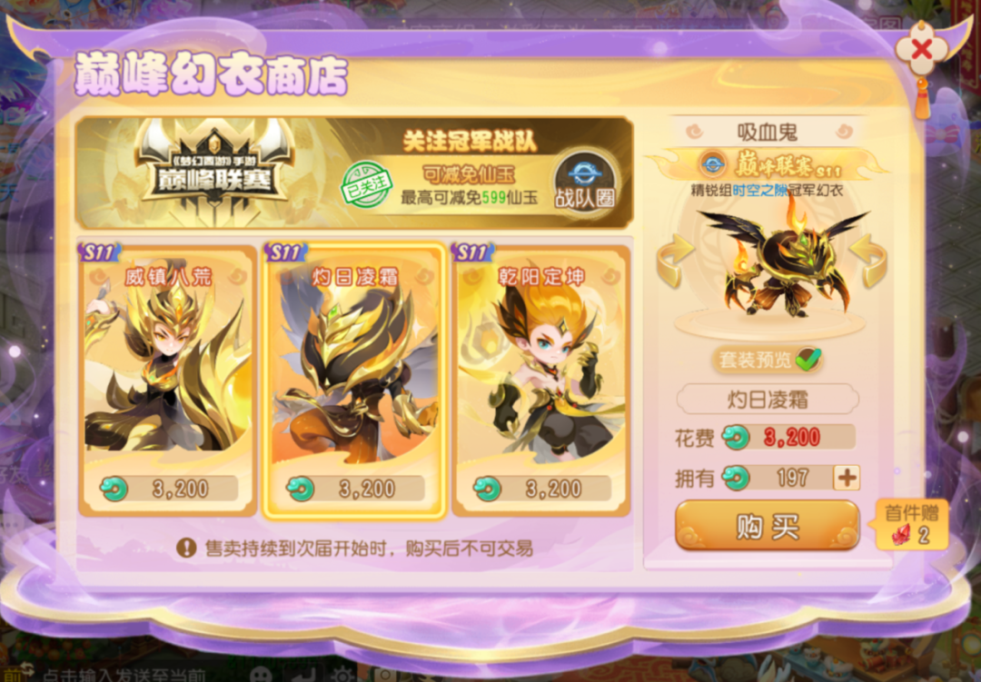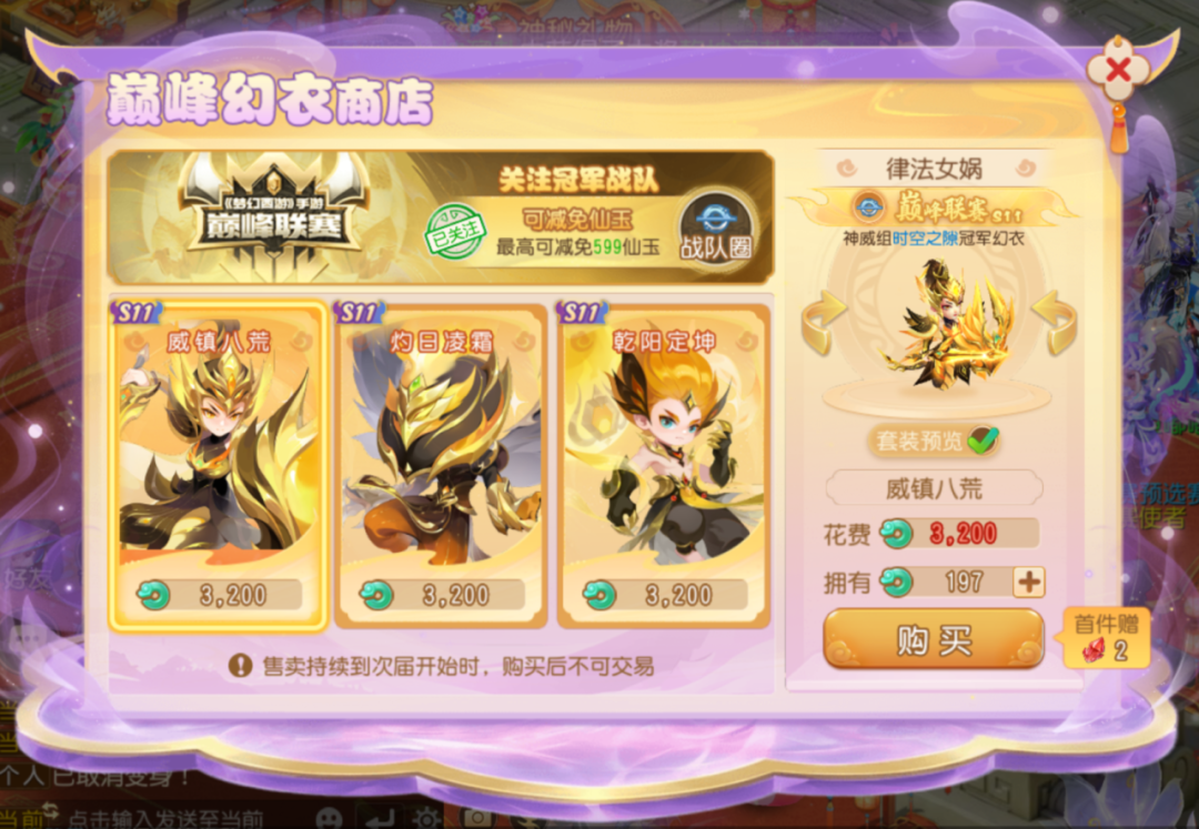 看完之后,各位少侠是否也心动了呢?本期特卖的3款月华幻衣购买首件时均赠送2个绑定的彤石。关注巅峰赛冠军战队空间,还可享受粉丝优惠福利哦~