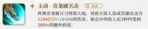 挥舞青龙偃月刀劈裂大地,对前方敌人造成英雄攻击力1104(920+184)%的伤害。被击中的敌人在5秒内受到200%的额外伤害。