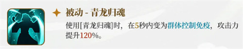 使用[青龙归魂]时,在5秒内变为群体控制免疫,攻击力提升120%。
