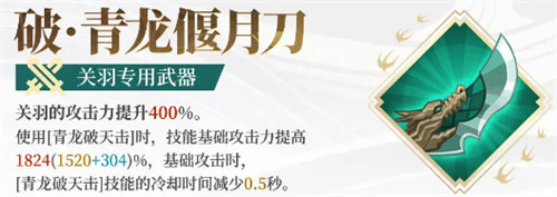 使用[青龙破天击]时,技能基础攻击力提高1824(1520+304)%,基础攻击时,[青龙破天击]技能的冷却时间减少0.5秒。