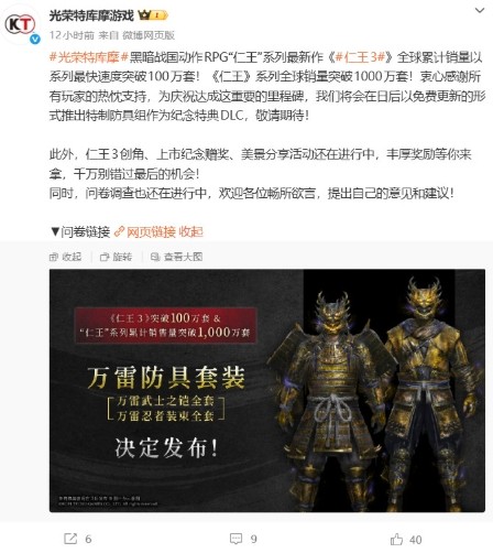 光荣官博宣布,为纪念《仁王3》全球销量以系列最快速度突破100万套这一里程碑,官方将在今后以免费更新的形式推出特制防具组,作为纪念特典DLC。