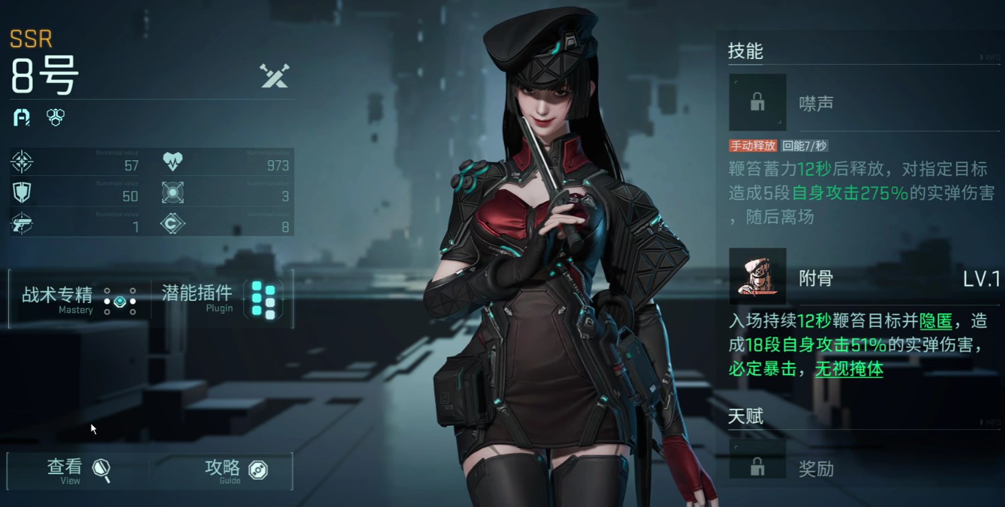 8号是游戏内的高属性值刺客单位,犀利攻击技能释放后,会对指定的目标造成基于自身基础攻击倍率为275%的伤害,且该伤害由四段,同时也是游戏内唯一一个可以隐身的角色。