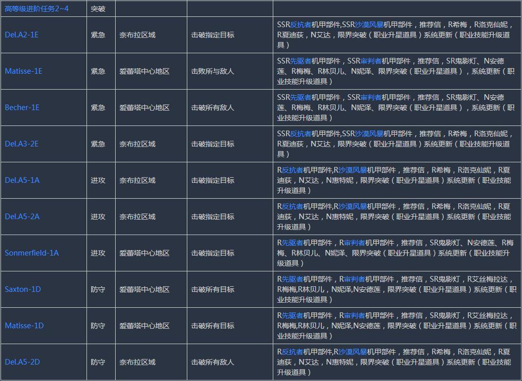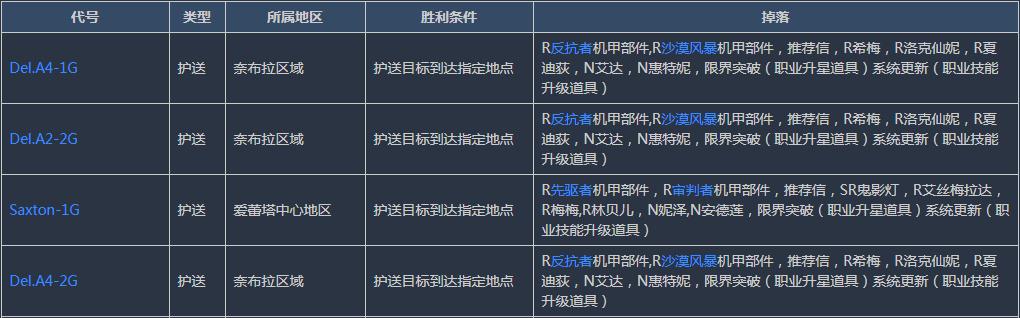奈布拉区域掉落:反抗者机甲部件,沙漠风暴机甲部件,推荐信,R希梅,R洛克仙妮,R夏迪荻,N艾达,N惠特妮,限界突破(职业升星道具)系统更新(职业技能升级道具)