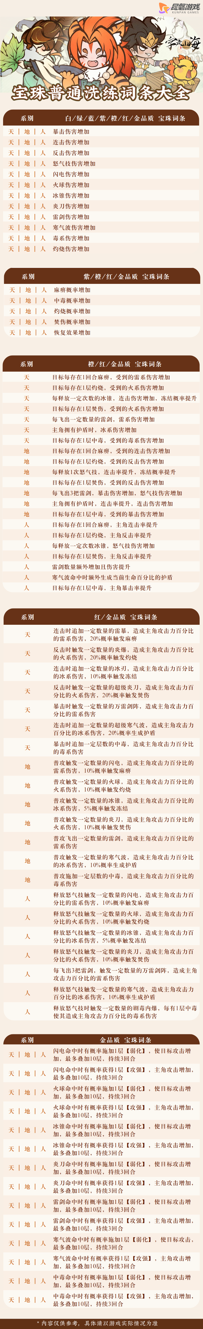 为了帮助大家更清晰地了解不同宝珠的潜力,更有策略地进行角色构筑,我们特地整理了目前游戏中所有品质及系别宝珠在洗练时可能出现的词条池。