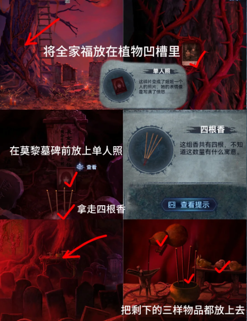 29、将【全家福】放进树上荆棘凹槽内得到莫黎【单人照】,将其摆在庙里莫黎墓碑前得到【四根香】,**供桌香炉里
